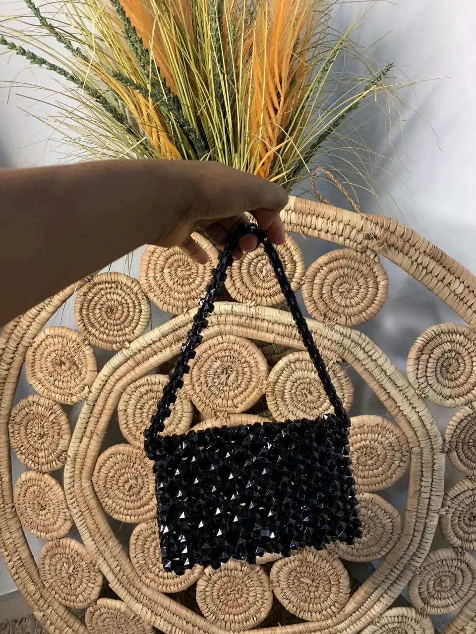 This handbag is a dazzling fusion of elegance and edge, designed for those who appreciate standout accessories. Crafted entirely from faceted black beads, it boasts a richly textured, jewel-like surface that catches the light from every angle, creating a sparkling effect that’s both glamorous and modern.